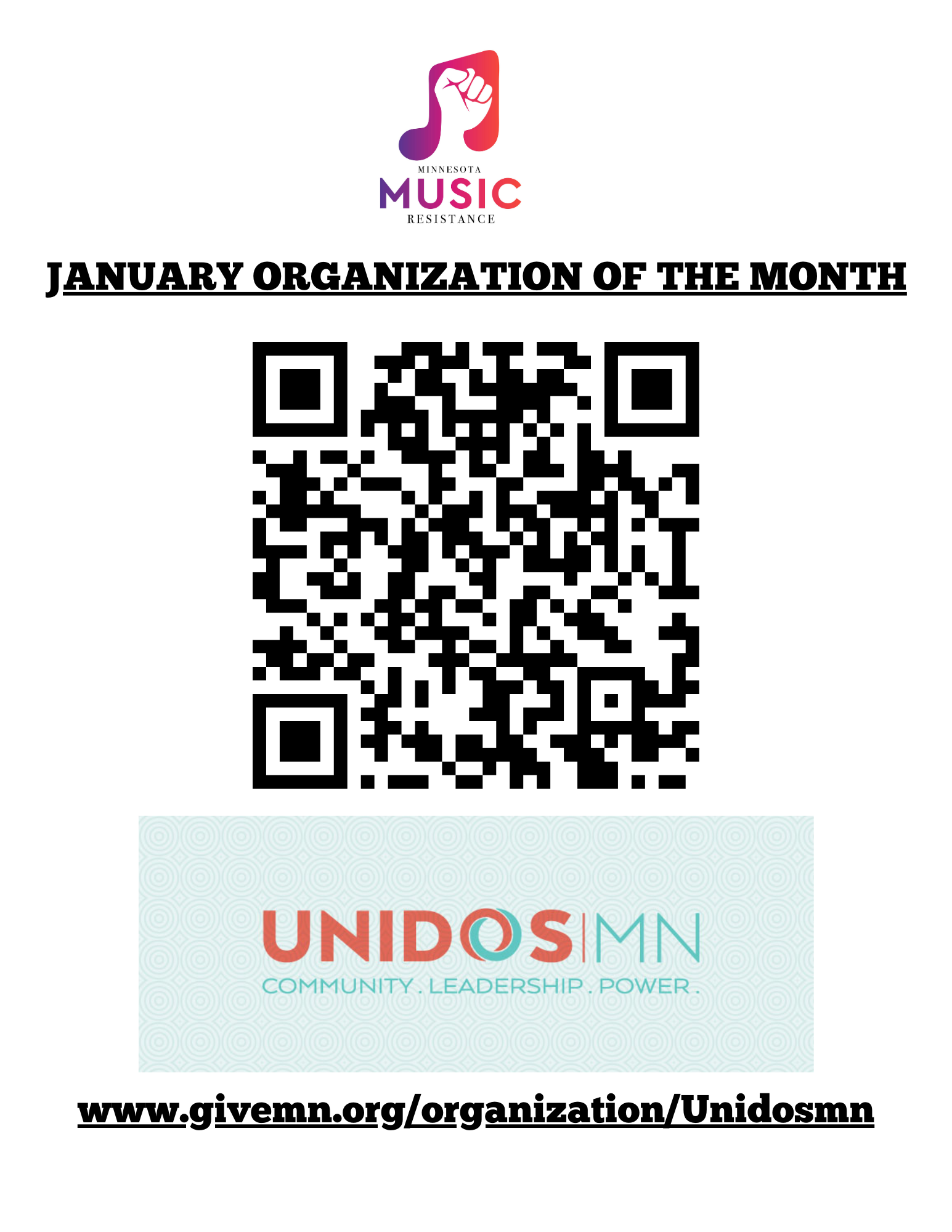 MMR proudly features a local organization each month. If you have a band, we encourage you to mention and display this graphic at your shows so that show-goers can support the organization’s work in our community. MMR’s Organization of the Month for December is Minnesota Music Resistance.